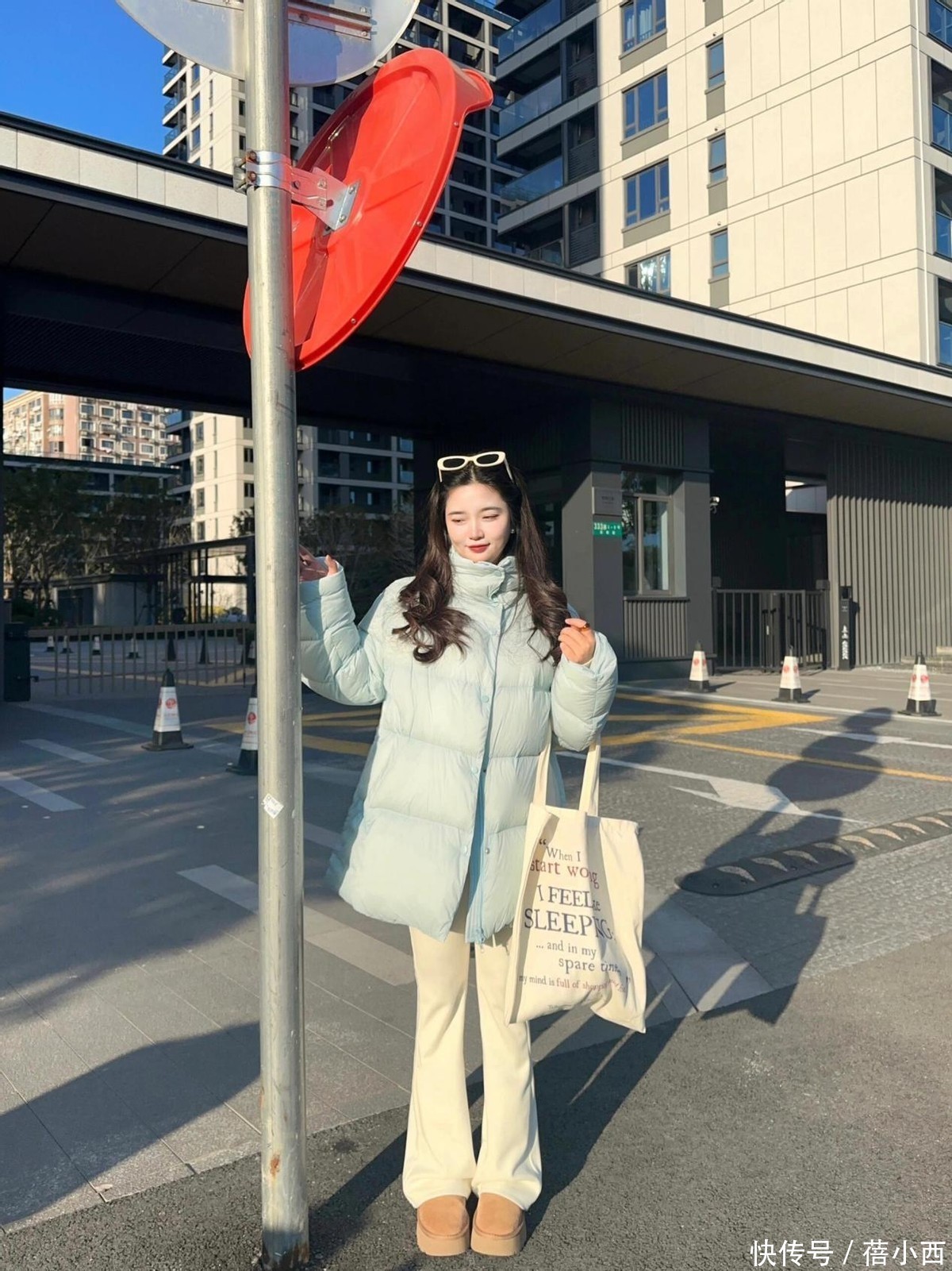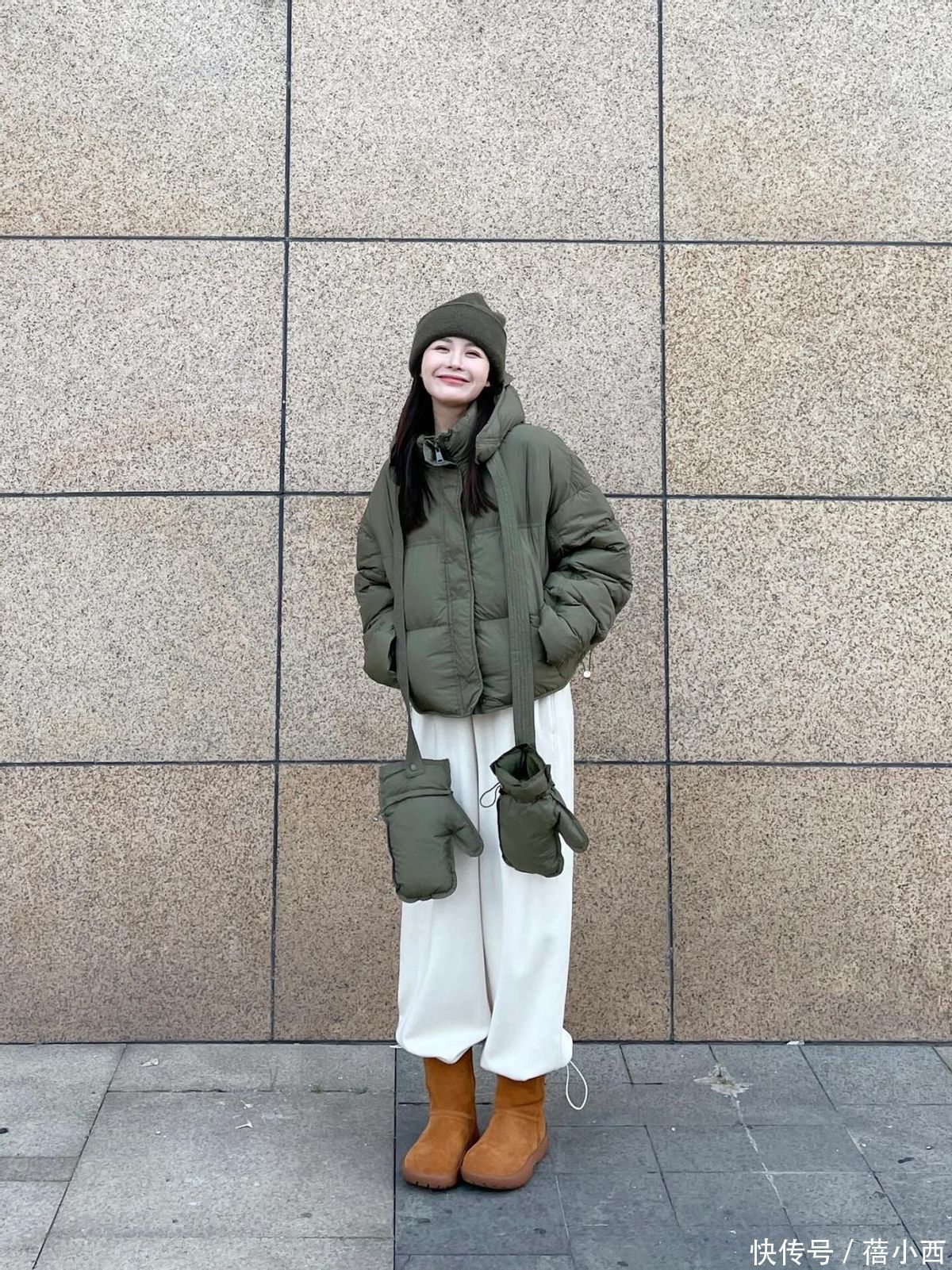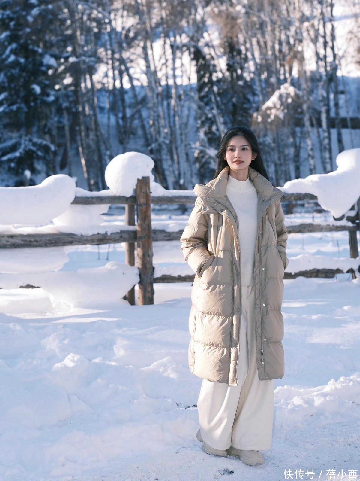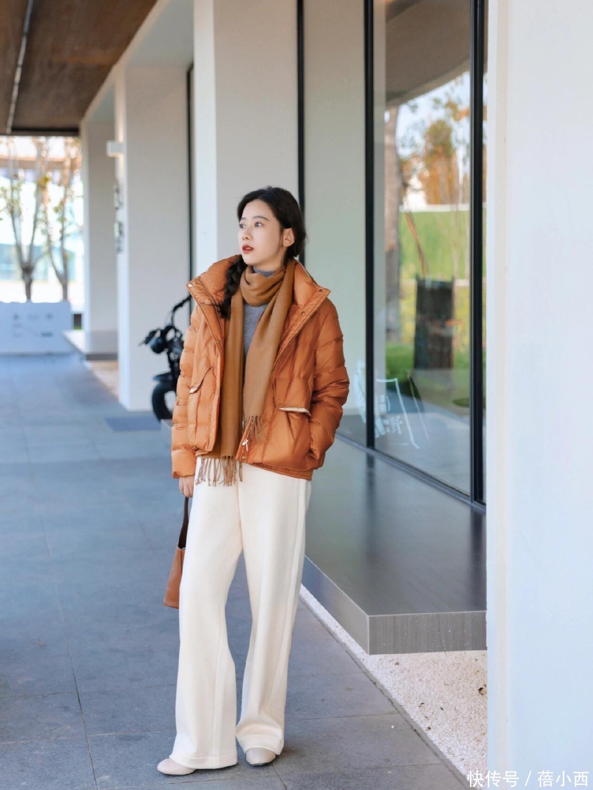冬天穿阔腿裤,推荐姐妹们尝试有垂感的面料,如丝绸、针织或高品质的棉麻,可以增加穿着的舒适度,同时让裤型保持良好的垂坠感,行走间更显优雅,上半身再搭配一件挺括的黑色羽绒服,整体看起来特别利落。