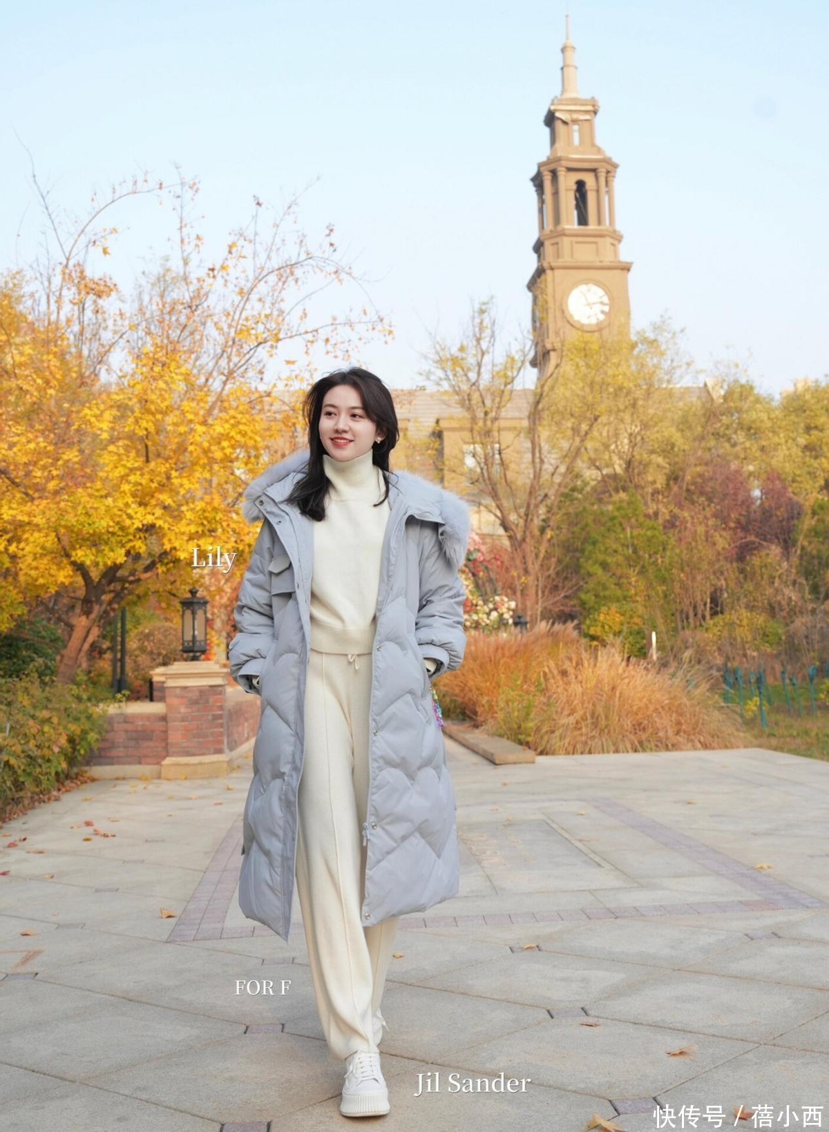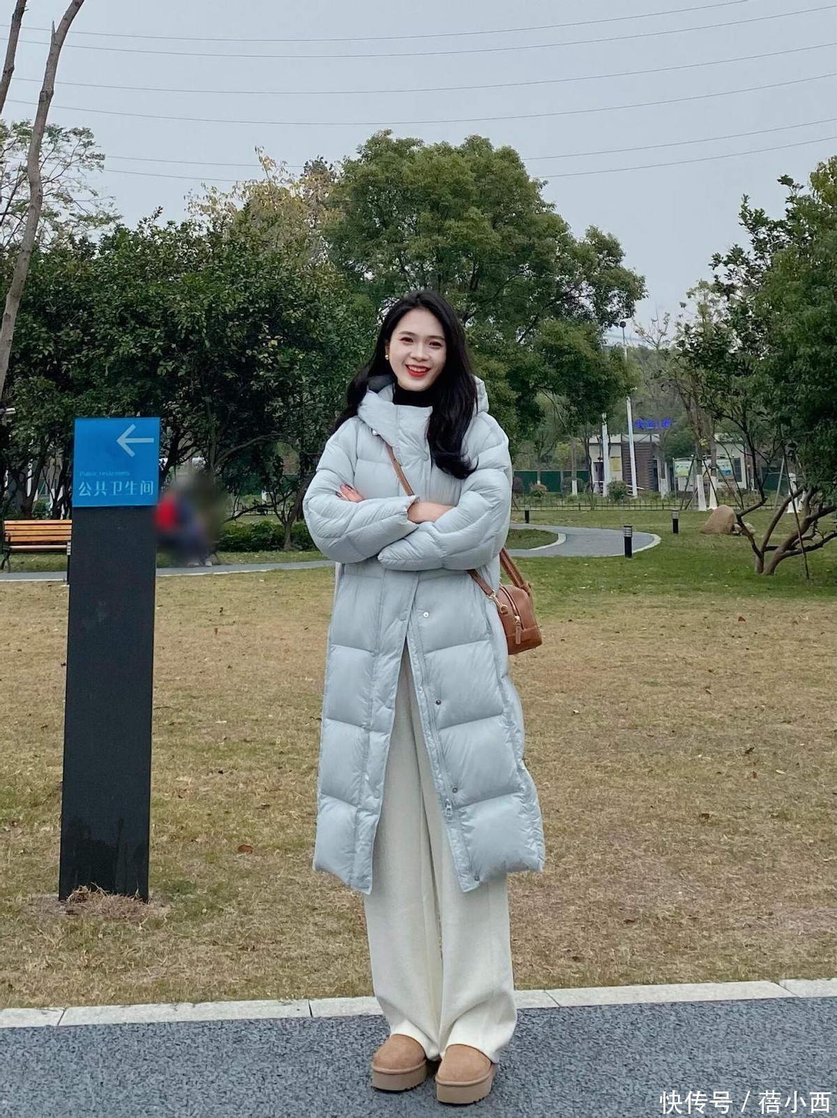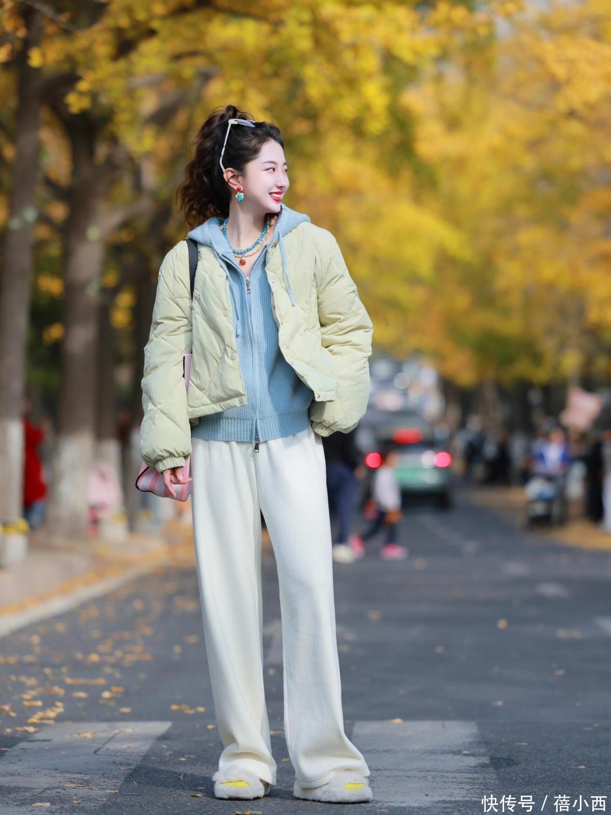 在配饰方面,咱们可以适度进行点缀一下,比如在羽绒服和阔腿裤的造型中搭配一些精致的首饰,如简约的项链或耳环,以及一个质感好的手提包,来提升整体造型的层次感。