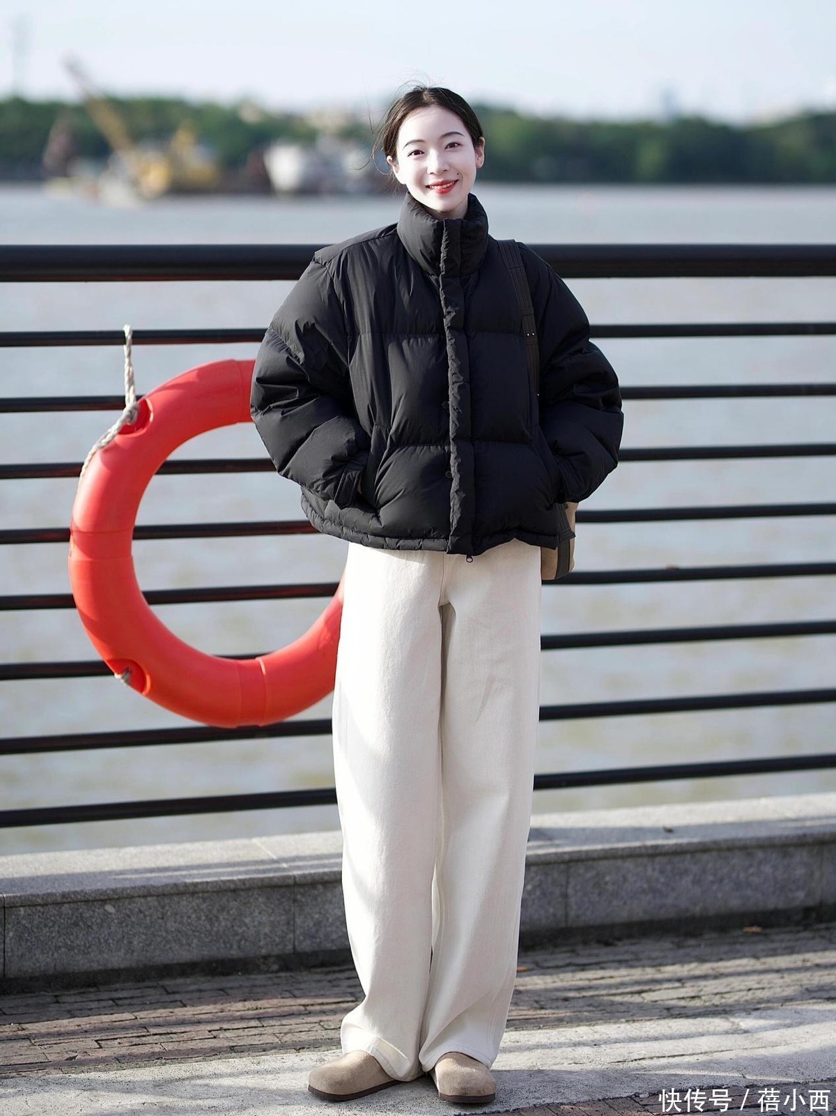 羽绒服搭配阔腿裤和平底鞋也很实用,这种组合特别舒适大方,毕竟羽绒服的保暖性能很强,与阔腿裤的休闲风格相结合。
